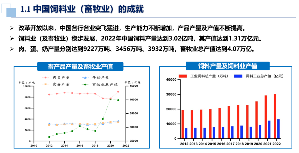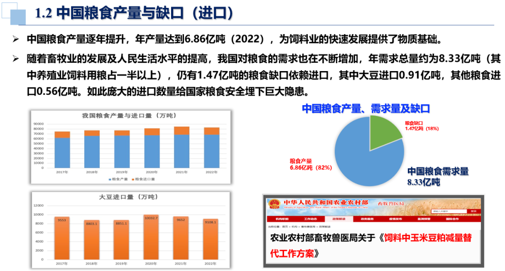 单老师首先指出,改革开放后中国种植业和养殖业飞速发展,取得巨大成就,但同时面对严峻挑战:2022年中国粮食产量6.86亿吨,相对8.33亿吨的年需求量,依然有1.47亿吨的缺口依赖进口;2022年饲料产量达到3.02亿吨,但也对粮食资源构成很大压力,并高度依赖进口大豆。