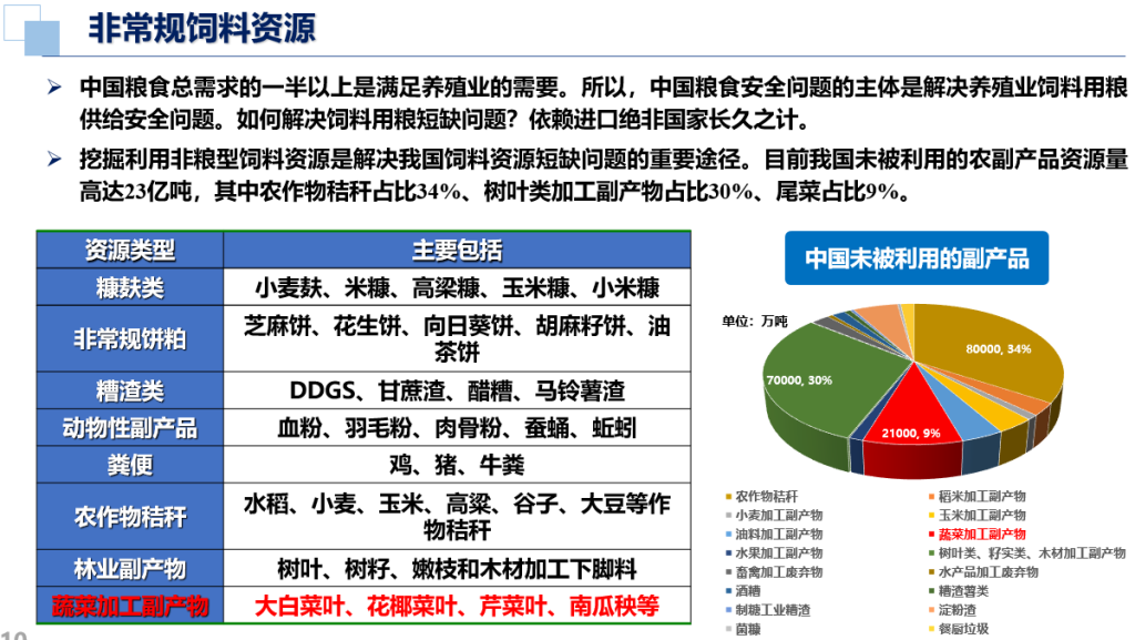 解决饲用粮食安全问题已经上升为国家战略考量,挖掘非粮型饲料资源的需求十分紧迫。目前我国未被利用的农副产品资源量高达23亿吨,其中农作物秸秆占比34%、树叶类加工副产物占比30%、尾菜占比9%。