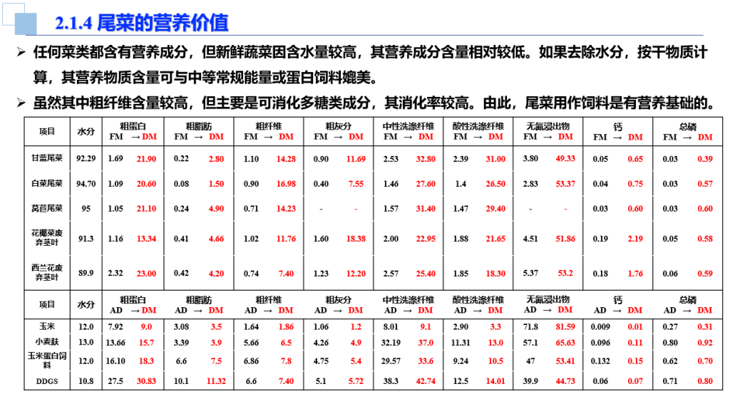 尾菜中含有营养成分,但因含水量较高,营养浓度相对较低。如果去除水分,按干物质计算,其营养物质含量可与中等常规能量或蛋白饲料媲美。虽然其中粗纤维含量偏高,但主要是可消化多糖类成分,消化率较高。由此可见,尾菜用作饲料是有营养基础的。