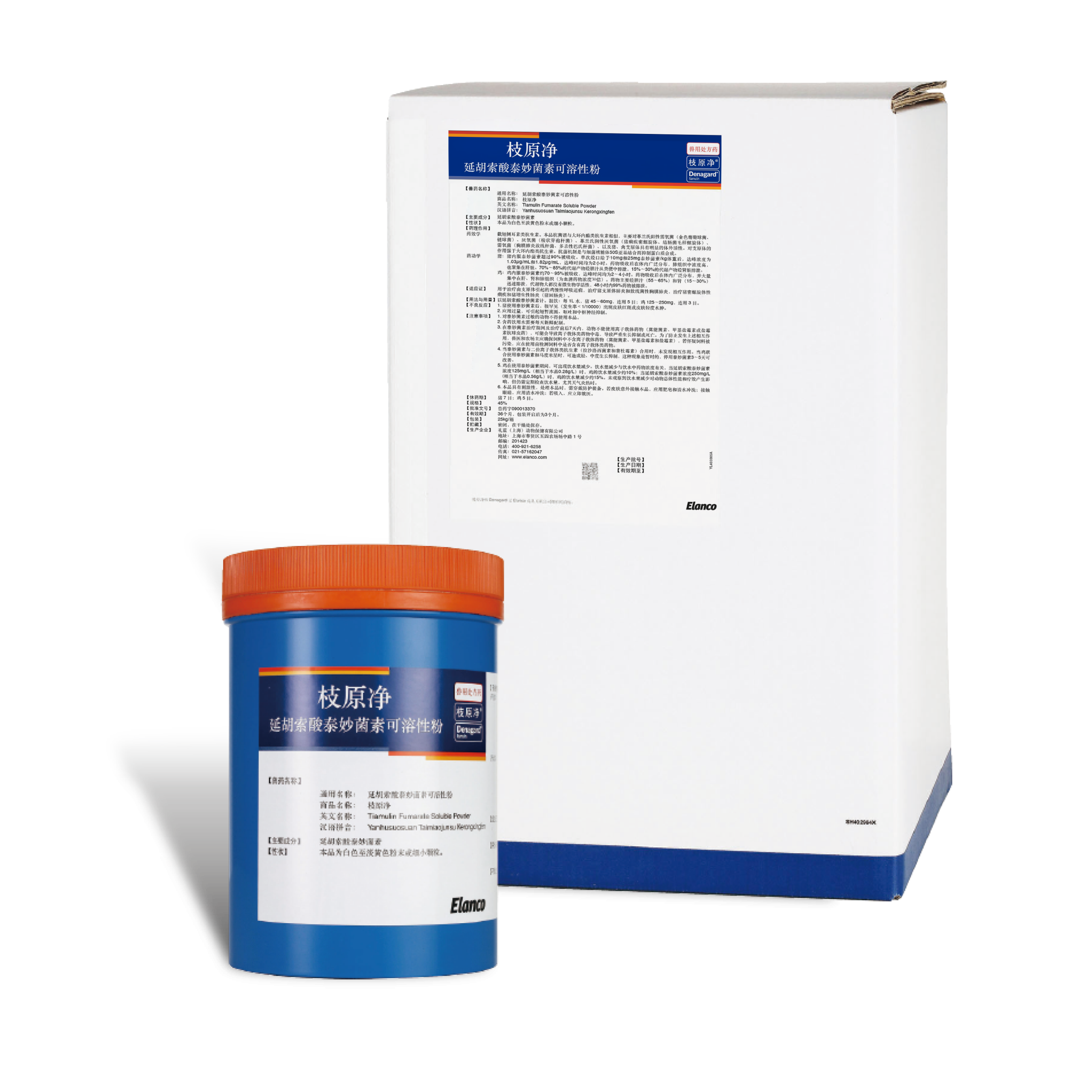 枝原净®45%可溶性粉,每100克含延胡索酸泰妙菌素45克。